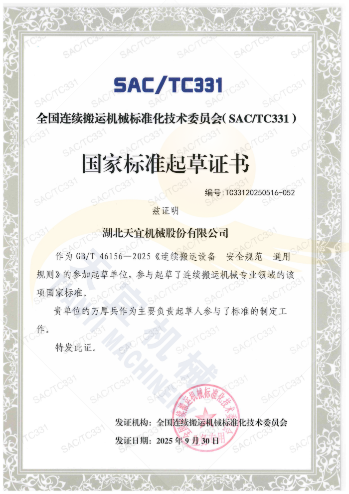 National Standard Drafting Certificate for Safety Specifications of Continuous Handling Equipment